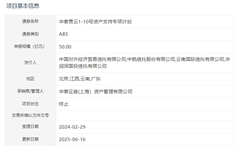 【大河财立方消息】6月16日,华泰贯云1-10号资产支持专项计划项目状态更新为“终止”。